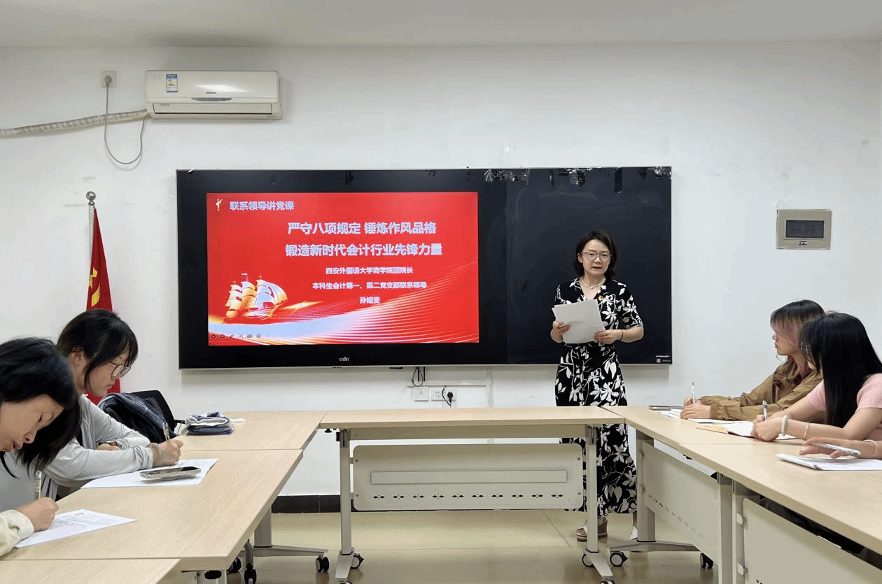 孙婧雯教授以党的二十大精神和深入贯彻中央八项规定精神学习教育为核心,结合《中国共产党廉洁自律准则》《中央八项规定实施细则》等党内法规讲授专题党课,系统阐释党性修养的时代内涵。她指出:“会计工作是经济活动的‘温度计’和‘防火墙’,党员学生更应将‘两个维护’贯穿于凭证审核、报表编制等每一个工作环节,以政治清醒保障职业清廉。”通过列举新时代财会领域服务国家战略的典型案例,引导学生将个人职业发展与党和国家的治理需求紧密结合。