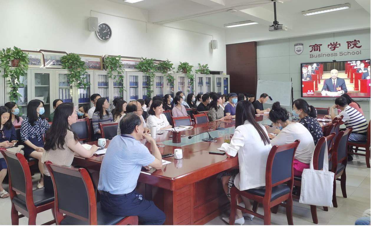 党委书记邓雯在总结中指出,省第十四次党代会是在全省全面建成小康社会、奋进全面建设社会主义现代化国家新征程的关键时期召开的一次十分重要的会议。会议既是对习近平总书记三次来陕考察重要讲话重要指示精神的贯彻落实,也为当前和今后全省经济社会发展各项工作明确了目标、任务、路径和举措。全体教师要深入学习、深刻领会省第十四次党代会精神,充分运用好教学、科研阵地,将最新时政、经济热点思想与自身商科专业教学科研相结合,贯穿人才培养及科学研究全过程,凝心聚力,共同谱写学院高质量发展新篇章。其次,要牢记立德树人根本任务,在探索和践行课堂思政与“三进”工作时,引导学生坚定文化自信,勇担青春使命,做中华先进文化的传播者、践行者,为实现中华民族伟大复兴的中国梦贡献青春力量。
