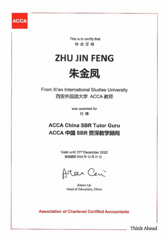 作为ACCA中国资深教学顾问,20年来,她始终潜心一线教学,爱岗敬业,爱校如家,爱生如子,注重学生差异化培养,人才培养成果显著。所带学生在ACCA全球统考中平均通过率在75%以上,领先全球(50%左右)25%,其中2019年6月平均通过率高于全球通过率近40%,极大增强了学生就业竞争力。学生贾荟宁于2020年6月获全球ACCA统考“第一”,她本人获评ACCA全国优秀指导教师,我校于2020年被授予“ACCA中国卓越创新教育机构”。