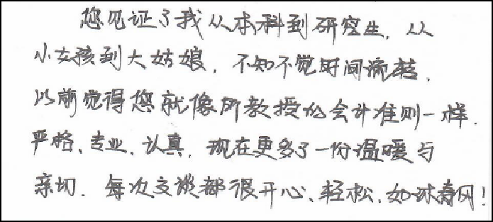 20年来,朱金凤教授立足本职,在平凡的工作岗位上,恪尽职守,甘于奉献,在同事和学生眼中,她“像会计准则一样严格、专业、认真”,她“有知识分子的博学与风度,大学教授的严谨与儒雅,母亲的慈爱与关怀”,无愧为一名德才兼备的高校教师、青年大学生的引路人!