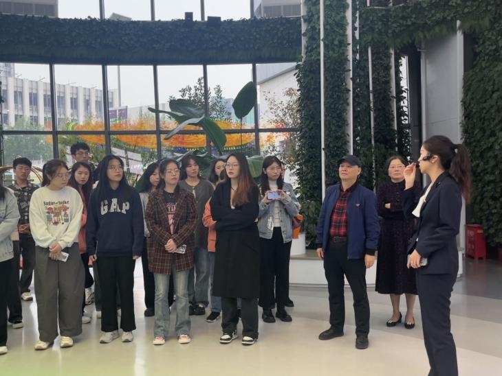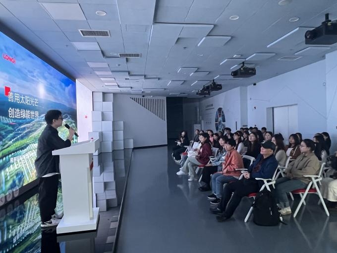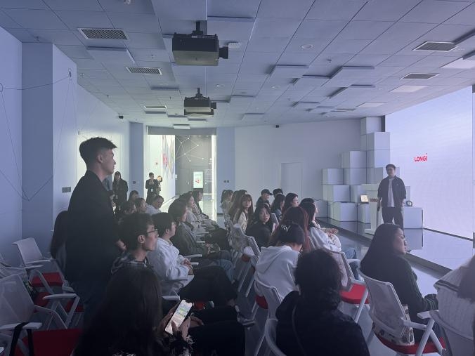 师生首先参观了隆基绿能·智慧能源展览馆,通过工作人员的英语讲解,了解了能源变迁的历史,以及公司致力于绿色能源发展,践行科技创新与善意经济,推动人类迈向更加美好、更可持续的未来目标。在智能制造部分,一同观看了隆基光伏产业链宣传视频,了解了从拉晶到硅片到电池组件即硅片制造的全过程。