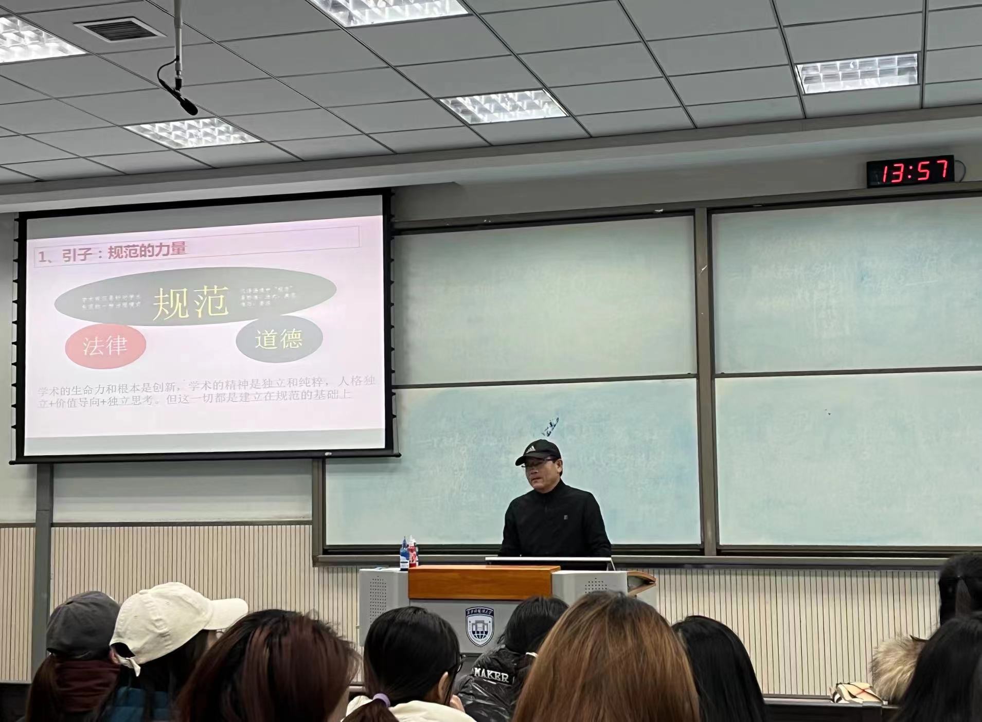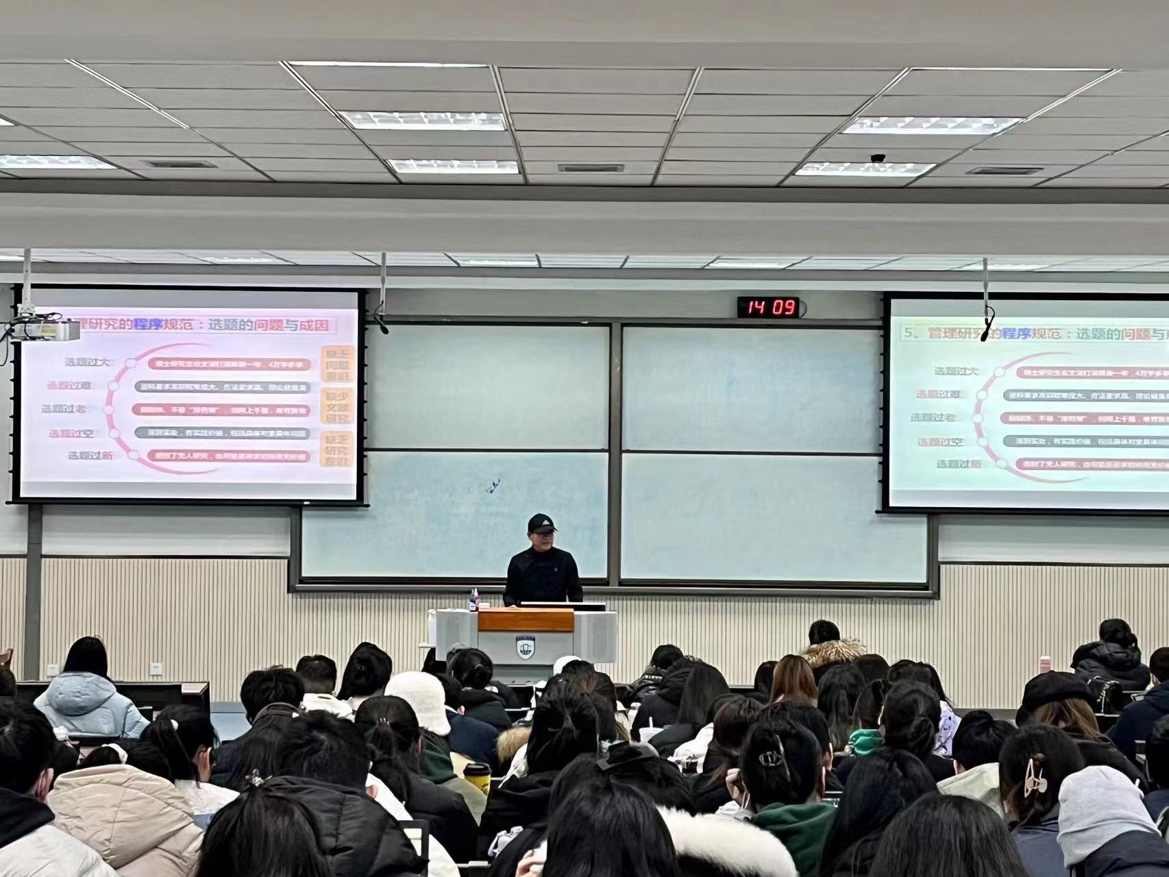 杨教授从学术规范要素说、学术行为的分类与解析、管理研究的基本规范等15个要点详细分析讲解学术规范与学术道德,强调在研究生阶段应注意学术的基本规范、程序规范、写作规范,在论文撰写过程中应规避选题过大、过难、过老等问题。基于多年的工作经验,杨教授对同学们提出三点建议:一要树立学术规范观,塑造学术品格,恪守学术诚信,严谨认真的学风,坚毅不屈的意志;二要将学术研究的原则、学术研究的范式、学习研究的标准,做到学规范、记规范、用规范、守规范;三要多读、多练、多写、多交流,发表或提交论文之前需审慎。