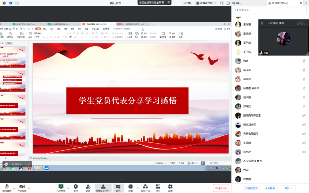 学生党员代表李颖、郑姝欣分享学习感悟。两位党员分别从学术道德和中国传统文化的角度指出,做科研时要具备独立思考能力与创新能力,不可急功近利,反对一切投机取巧行为;只有坚持艰苦奋斗的学风,科学研究才能真正有所创新、有所突破。