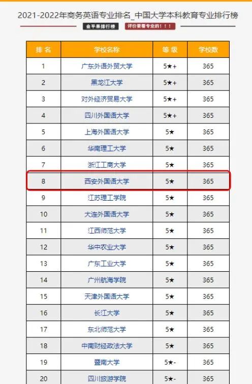 由杭州电子科技大学中国科教评价研究院、浙江高等教育研究院和高教强省发展战略与评价研究中心、武汉大学中国科学评价研究中心联合中国科教评价网(www.nseac.com) 共同推出的《中国大学及学科专业评价报告(2021-2022)》于2021年3月发布。我校商务英语专业喜获五星专业评价,在全国365家开设商务英语专业的高校中排名第八。