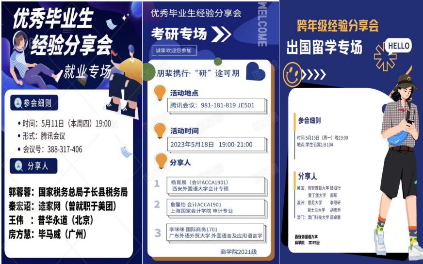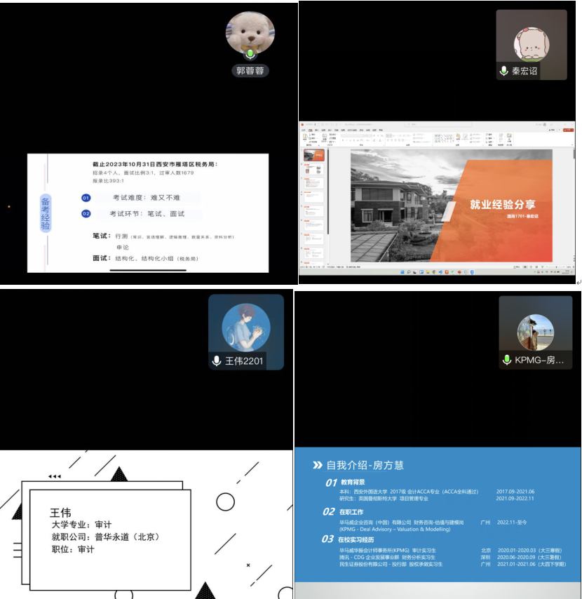 为充分发挥工口漫画 优秀毕业生的榜样引领作用,为在校学生和优秀毕业生之间搭建相互探讨、相互借鉴、共同成长的交流平台,帮助2021级学生提前了解就业、考研、留学等方面的问题,引导鼓励同学们提前做好职业规划,明确未来发展目标,5月11日至5月15日,工口漫画 2021级特别邀请2017级优秀校友代表及2019级优秀毕业生代表,分别围绕就业、考研、留学等方面的成长感悟做经验分享,为学弟学妹们答疑解惑、指引方向。