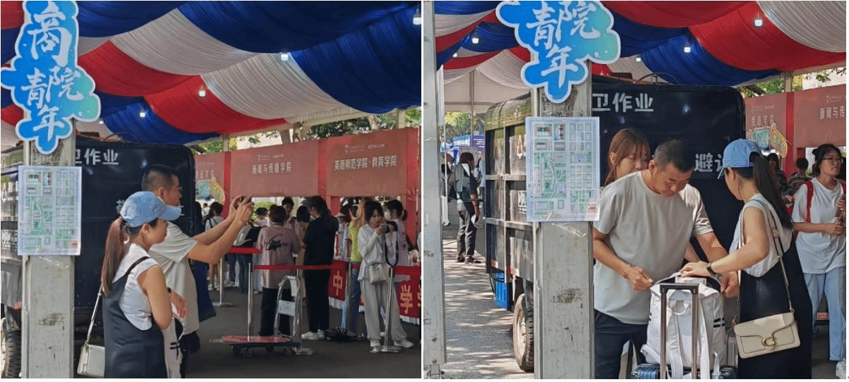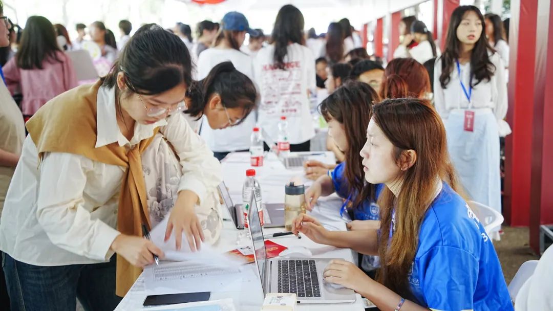 进入校门后就有热情的学长学姐欢迎大家,介绍报到流程。志愿者们和老师们正在为同学分发校园一卡通和宿舍钥匙,帮助同学们完成报到。这样,一个小“商院人”就诞生啦!