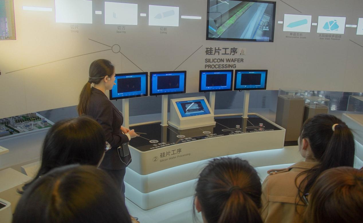 师生首先参观了隆基绿能智慧能源展览馆,通过工作人员的讲解与介绍,了解了能源演变的历程以及公司的品牌文化与未来目标。在智能制造部分,生动的场景应用为师生呈现了四个工序的工作流程,了解了硅片制造的全过程。接着,在工作人员带领下,对隆基的财务、技术等方面有了更全面的认知,进一步拓宽了师生对新能源产业的理解。