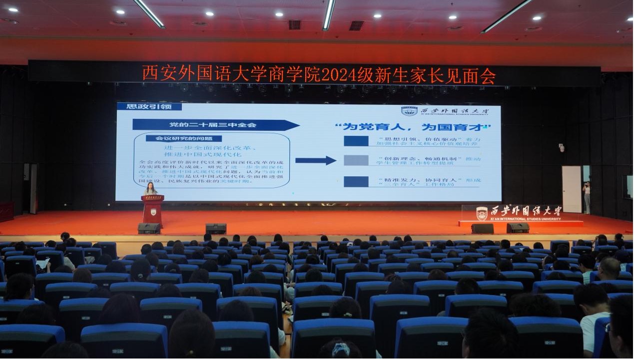 邓雯代表学院对新生家长的到来表示欢迎,并对家长和学生给予学院的信任表示感谢。她简要介绍了校、院基本情况、学院人才培养理念、学生思想政治教育以及学院开展的特色活动等,同时围绕新时代推进教育强国的大背景,结合党的二十届三中全会精神,为2024级新生讲授“开学第一课”。她从思想引领、社会实践、创新创业三个层面为新生如何在大学阶段坚持价值引领、培养创新能力、拓宽学术视野做了阐释,引导全体新生坚定理想信念、厚植家国情怀,努力成为有理想、肯奋斗、能吃苦、敢担当的时代新青年。