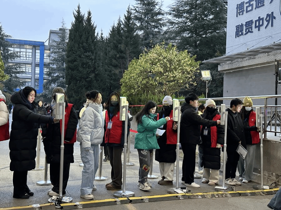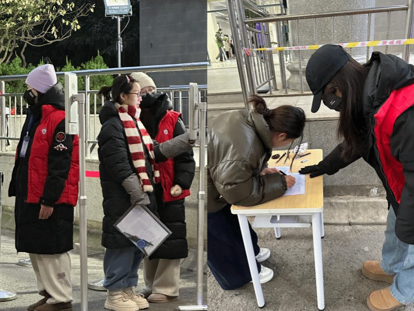 考试前,志愿者参与岗位培训,认真学习考试流程、考场规则以及应急处理预案等内容,力求在服务过程中做到严谨、专业、规范。考试当日,志愿者统一着装,提前到岗,在凛冽的寒风中,以热情洋溢的笑容和饱满的精神状态迎接每一位考生的到来。在存放物品处,考生们在志愿者的引导下,进行有序的物品存放;在考场入口处,志愿者们耐心地为考生进行安检,引导他们有序进入教学楼;在考场周围,志愿者们站岗巡逻,及时解答考生们的疑问,为考生提供贴心的帮助。
