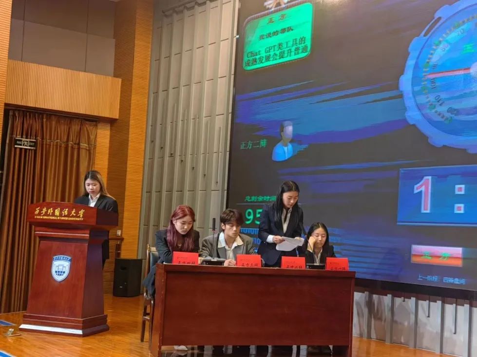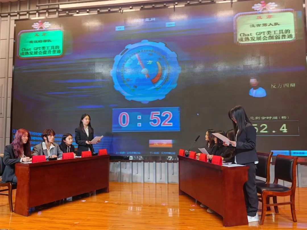 在班级赛决赛中,会计ACCA2201班的我说的都队和商务英语2202班的没有男人队展开激烈角逐!他们的辩题是ChatGPT类工具的成熟发展是否会削弱普通民众,双方队伍可谓是棋逢对手,正反双方的辩论可谓是有条不紊,言语犀利,逻辑清晰,充分发挥了团体合作精神。