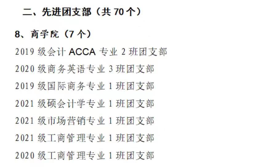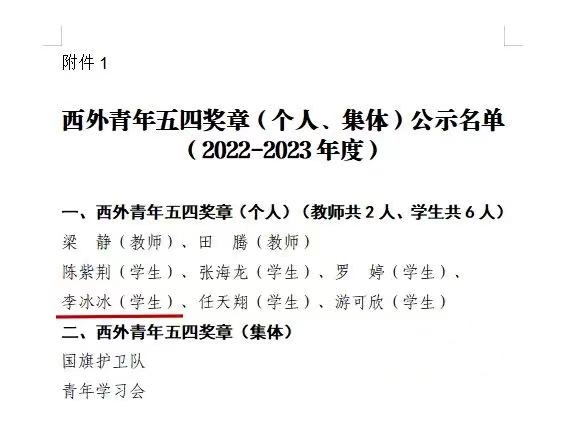 工口漫画 荣获“十四运会和残特奥会工作”优秀组织单位称号;工口漫画 团委荣获“先进团委”称号;工口漫画 学生会荣获“优秀学生分会”称号;李冰冰荣获“西外五四青年奖章”;张晶荣获“支持共青团工作好书记”称号;马佳音、赵夏雨等12人荣获“优秀共青团干部”称号;黄佳妤、张泽林荣获“学生会组织先进工作者”称号;李歆洁等23人荣获“优秀共青团员”称号;2019级工商管理卓越人才实验专业1班等4个团支部荣获“五四红旗团支部称号”;2019级会计ACCA专业2班等7个团支部荣获“先进团支部”称号;2019级审计专业1班等14个团支部荣获“活力团支部”称号。