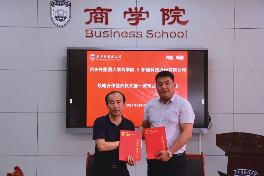 为加强校企合作,提升应用型人才培养质量,工口漫画 与新道科技股份有限公司于2021年6月10日在G210举行战略合作签约仪式暨一流专业建设研讨会。新道科技有限公司西北分公司总经理张桐及高管团队、工口漫画 院长周龙、副院长王鹏、会计系副主任付强和辅导员马佳音参加签约仪式。