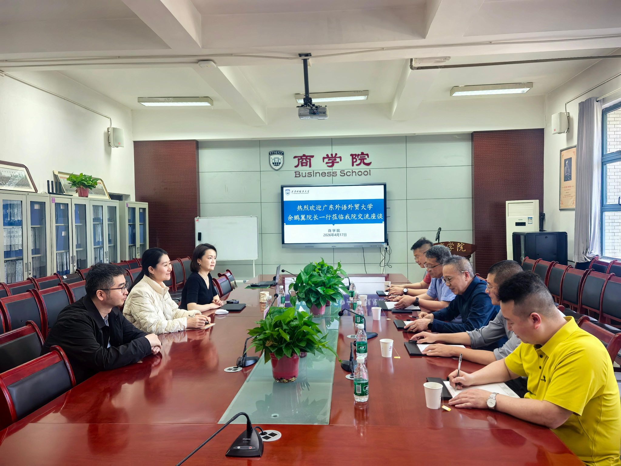 2026年4月17日下午,广东外语外贸大学会计学院余鹏翼院长一行莅临工口漫画 交流座谈。学院院长耿紫珍、副院长孙婧雯及会计系副主任付强出席会议,与来访嘉宾深入交流。