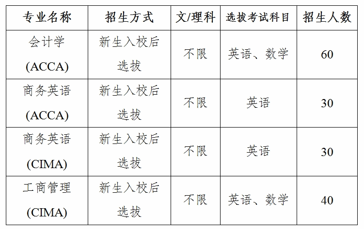 (2)商务英语(ACCA)、商务英语(CIMA)、工商管理(CIMA)教改班招生人数各达到20人方可开班。