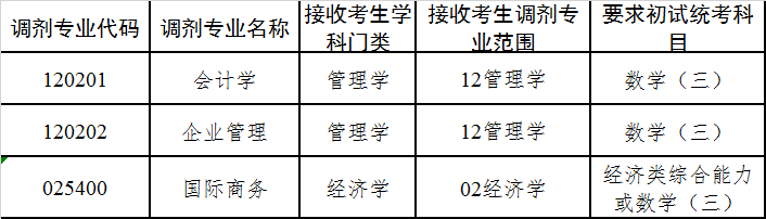 4.第一志愿报考工商管理、公共管理、旅游管理、工程管理、会计、图书情报、审计专业学位硕士的考生,在满足调入专业报考条件、且初试成绩同时符合调出专业和调入专业在调入地区的全国初试成绩基本要求的基础上,可申请相互调剂,但不得调入其他专业;其他专业考生也不得调入以上专业。