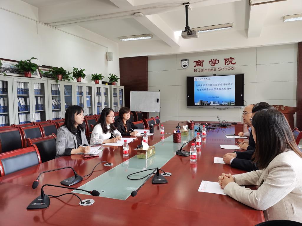 4月27日,兰州财经大学外国语学院商务英语专业负责人许菁、教研室主任李莹、副主任孙志婕三人前来工口漫画 调研学习国家级“一流专业”建设经验。副院长王鹏、商务英语专业负责人刘军伟、教研室主任张嘉瑶、副主任王娜参加了交流座谈会。
