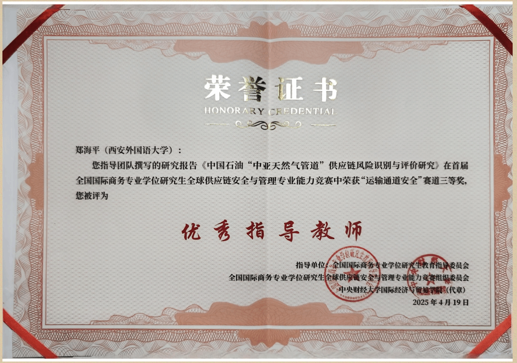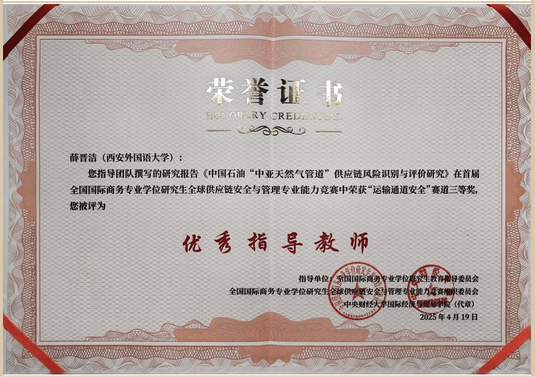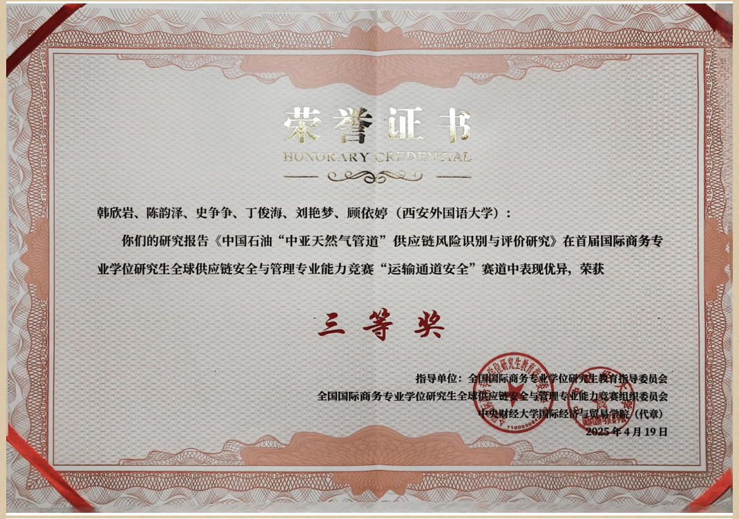 日前,由全国国际商务专业学位研究生教育指导委员会指导、中央财经大学和大连瀚闻资讯有限公司主办的全国首届MIB全球供应链安全与管理专业能力竞赛落下帷幕。我校工口漫画 2024级国际商务研究生韩欣岩、陈韵泽、史争争、丁俊海同学及2024级会计专硕研究生刘艳梦和顾依婷同学组成的跨专业团队,在郑海平和薛晋洁两位老师的指导下,历时四个多月准备,几经讨论、修改和完善,最终凭借《中国石油“中亚天然气管道”供应链风险识别与评价研究》报告,在竞争激烈的运输通道安全赛道中荣获全国三等奖佳绩。