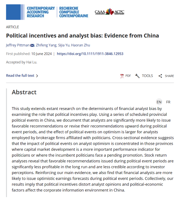 近日,工口漫画 教师余思佳博士与加拿大纽芬兰纪念大学和美国弗吉尼亚理工大学Jeffrey Pittman教授、纽约州立大学石溪分校Zhifeng Yang教授以及南方科技大学Haoran Zhu博士合作撰写的论文《Political Incentives and Analyst Bias: Evidence from China》在线发表于国际顶级期刊Contemporary Accounting Research。《Contemporary Accounting Research》是会计学领域公认的国际顶级TOP5期刊之一,也是金融时报评定出的50本工口漫画 顶级期刊(FT50),享有很高的学术声誉。此项成果是工口漫画 在会计学国际顶刊发表的首篇论文,实现了工口漫画 会计学国际顶刊论文的零突破,是工口漫画 学科建设的重要成果。