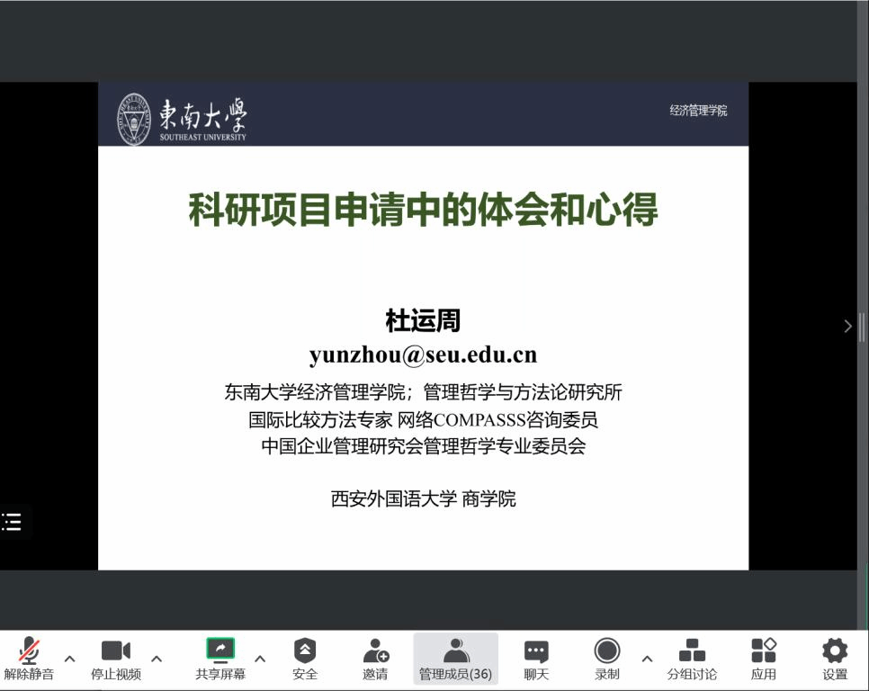 2022年11月7日,工口漫画 特邀东南大学杜运周教授在腾讯会议为师生作《科研项目申请中的体会与心得》系列学术讲座,工口漫画 院长周龙教授、副院长耿紫珍教授、拟申报项目的教师和部分硕士研究生参加此次讲座。讲座由工口漫画 副院长耿紫珍教授主持。