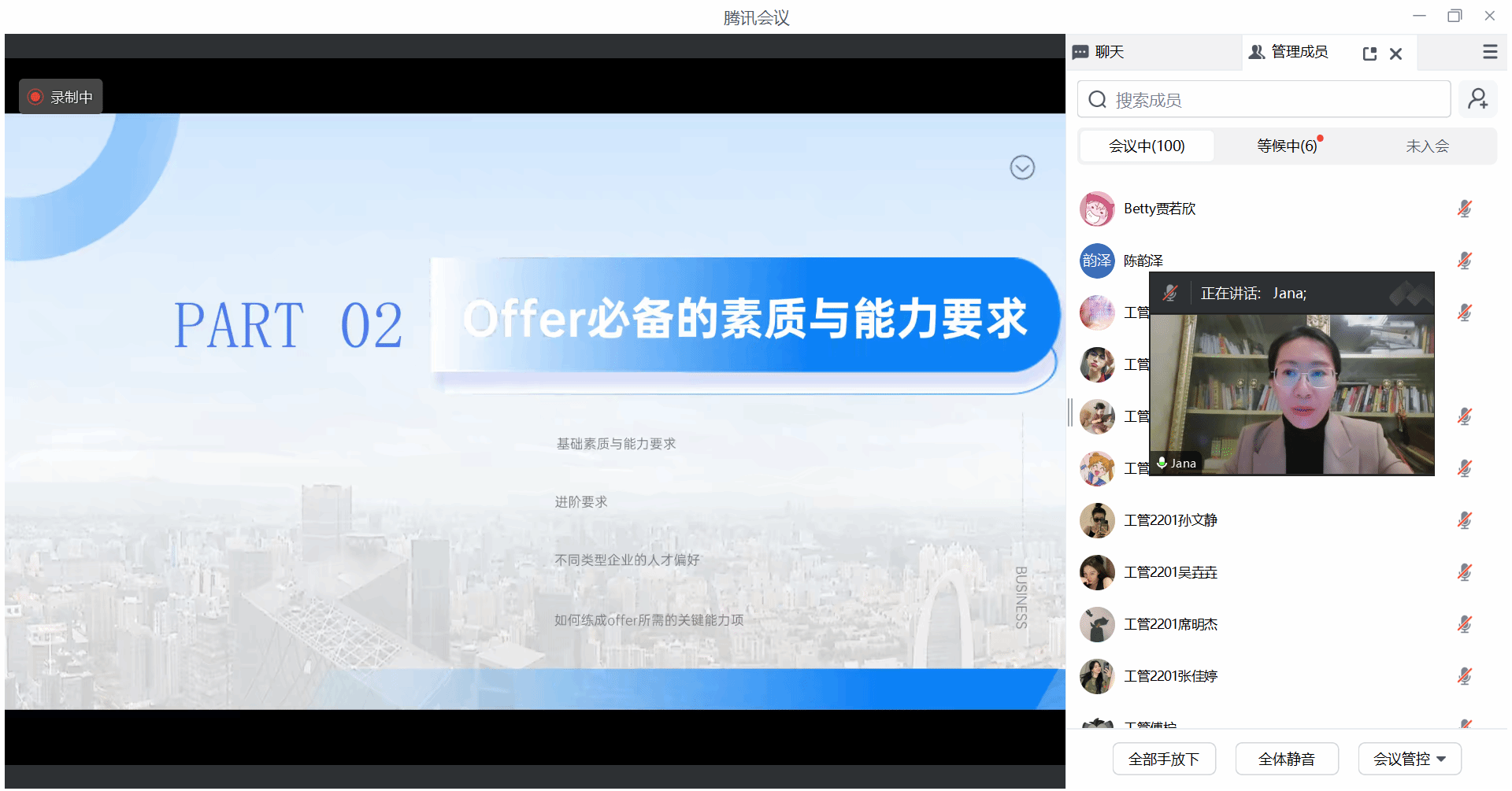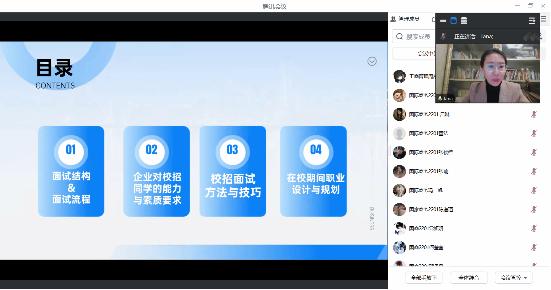 贾萍女士的讲座内容,主要从面试结构和流程、企业对校招同学的能力与素质要求、校招面试方法与技巧以及在校期间的职业设计与规划四个方面进行,如图所示。 贾总从企业需求端,详细地剖析了企业对毕业生的素质与能力要求,如表达与总结、学习能力、语言的听说读写、适应力以及主观能动性。此外,贾总也站在学生的视角,帮助同学们分析了面试技巧,细致入微地传授了面试中的制胜法宝。特别分享了无领导小组面试的流程、题目解析、面试标准以及考评维度、无领导小组的注意事项。