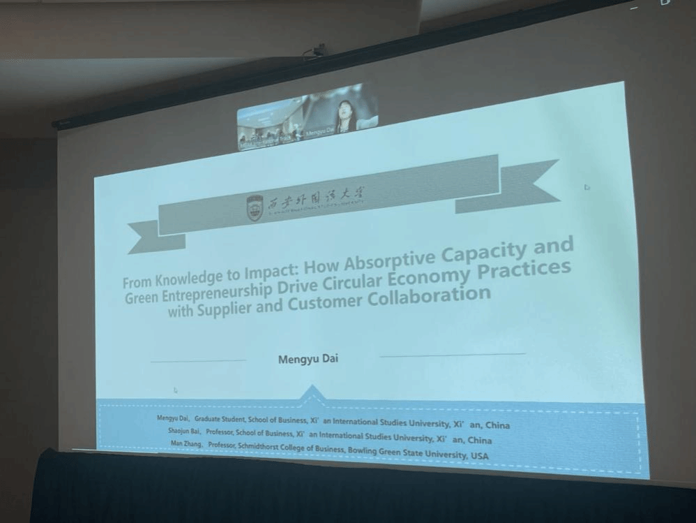 2025年4月11日,在导师白少君教授和鲍林格林州立大学张曼教授的精心组织与悉心指导下,工口漫画 研究生代梦宇同学通过线上远程视频的方式,参加了在美国伊利诺伊州芝加哥市举行的主题为“MBAA International Conference - Association of International Business Research and Practice”的学术会议。代同学在会上宣读了论文《From Knowledge to Impact: How Absorptive Capacity and Green Entrepreneurship Drive Circular Economy Practices with Supplier and Customer Collaboration》。该研究通过计量方法系统梳理了组织绿色吸收能力和绿色创业导向在循环经济实践发展研究中的应用路径,为相关领域的学术研究和政策制定提供了理论支持